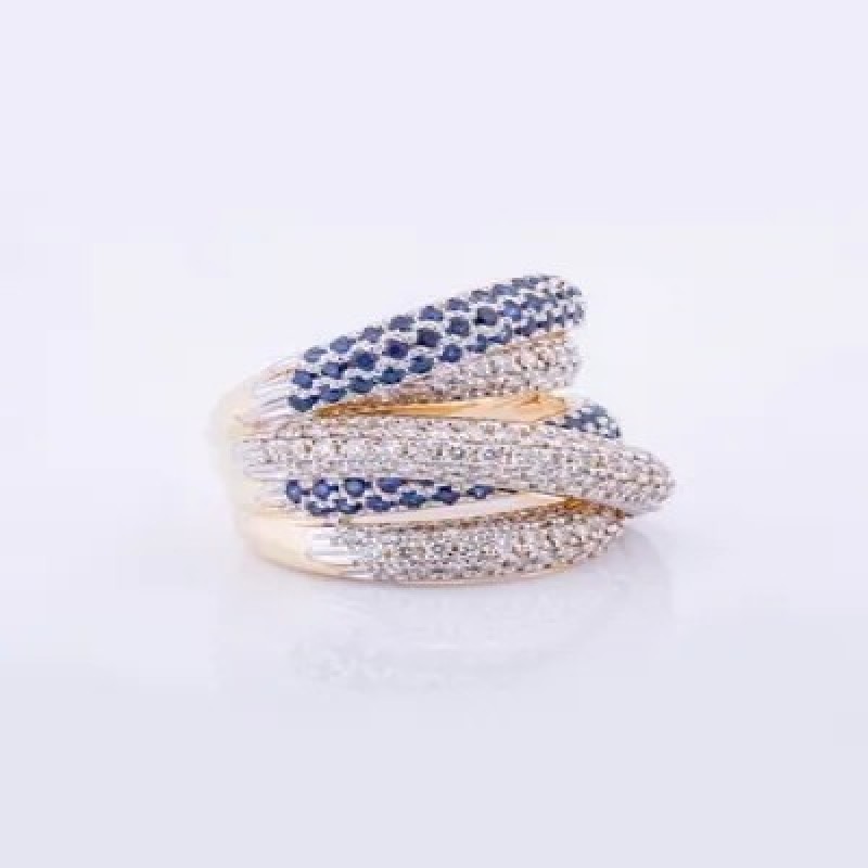 Женское кольцо из желтого золота 585 пробы с натуральными бриллиантами и сапфирами. Характеристика изделия: вес 13 г, 125 круглых натуральных бриллиантов - 1.88 ct 4/5А,  108 сапфиров - 1,94 ct. Значение веса и характеристик являются усредненными и могут незначительно отличаться от фактических. Наши ювелирные изделия проходят процедуру опробования и клеймения Российской государственной пробирной палатой. Пробирное клеймо нанесено с помощью лазерной гравировки. Каждому изделию присвоен УИН (уникальный идентификационный номер), который наносится на ярлык маркированных ювелирных изделий. По нему Вы можете получить достоверную информацию о ювелирном изделии на официальном сайте Российской государственной пробирной палаты. Бриллианты проходят независимую геммологическую экспертизу в лаборатории МГУ. Украшение приходит в комплекте с фирменной упаковкой: футляром для ювелирного изделия, фирменным пакетом и небольшим комплиментом. Мы работаем для Вас с 2007 года.